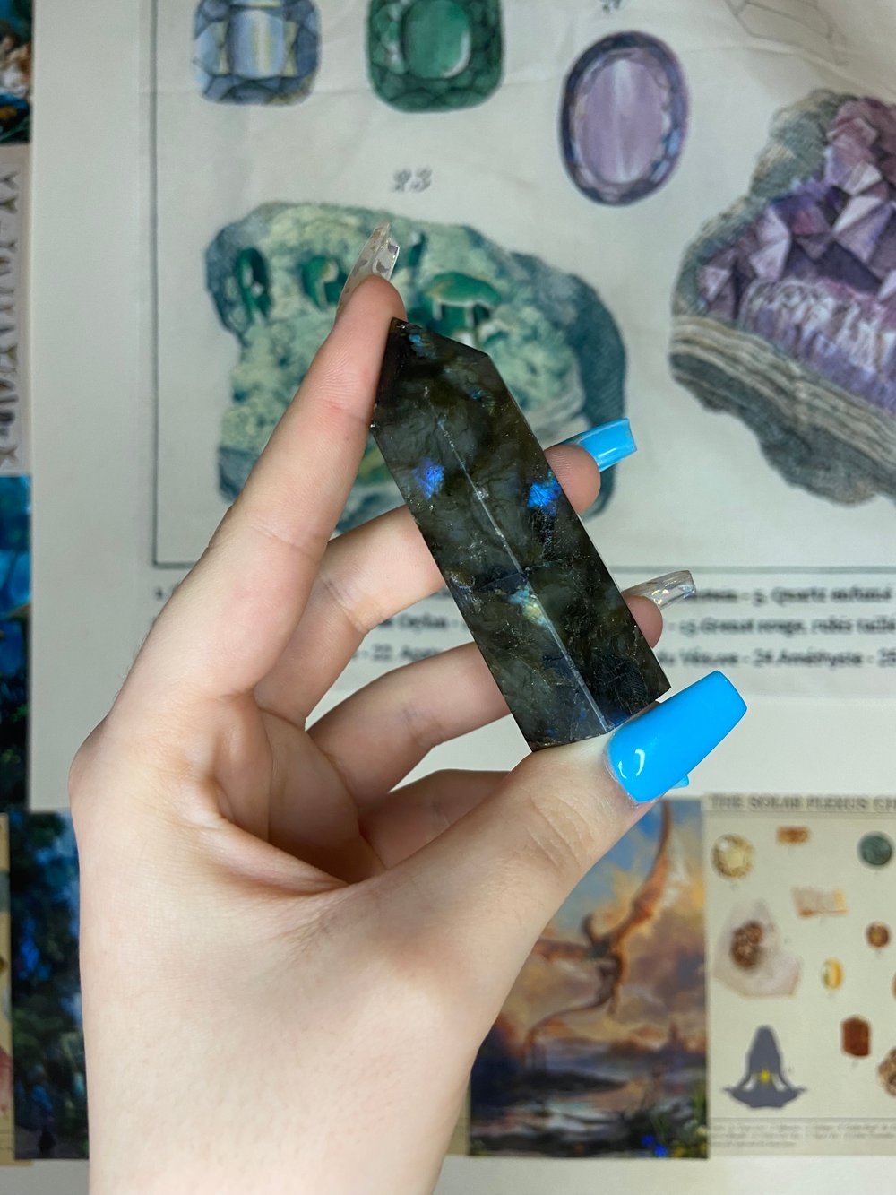 Medium sized labradorite tower with delicate circular flashes in a variety of shades across the entire body.